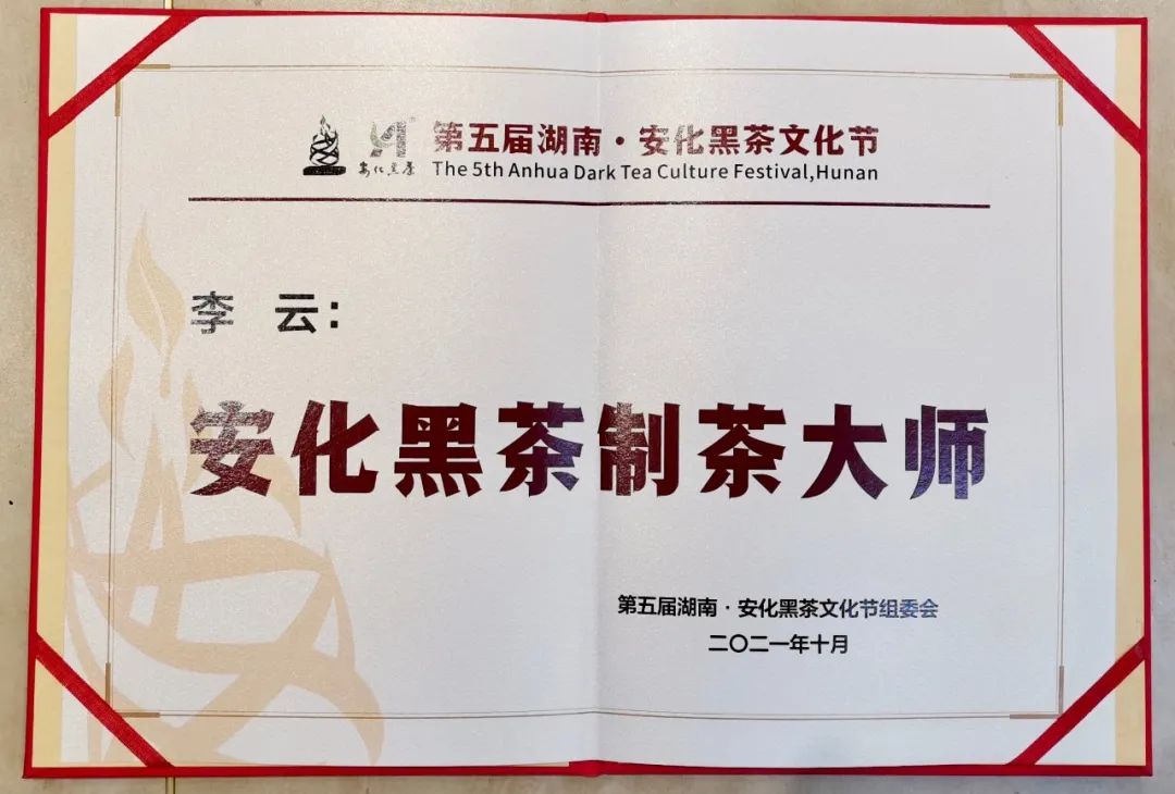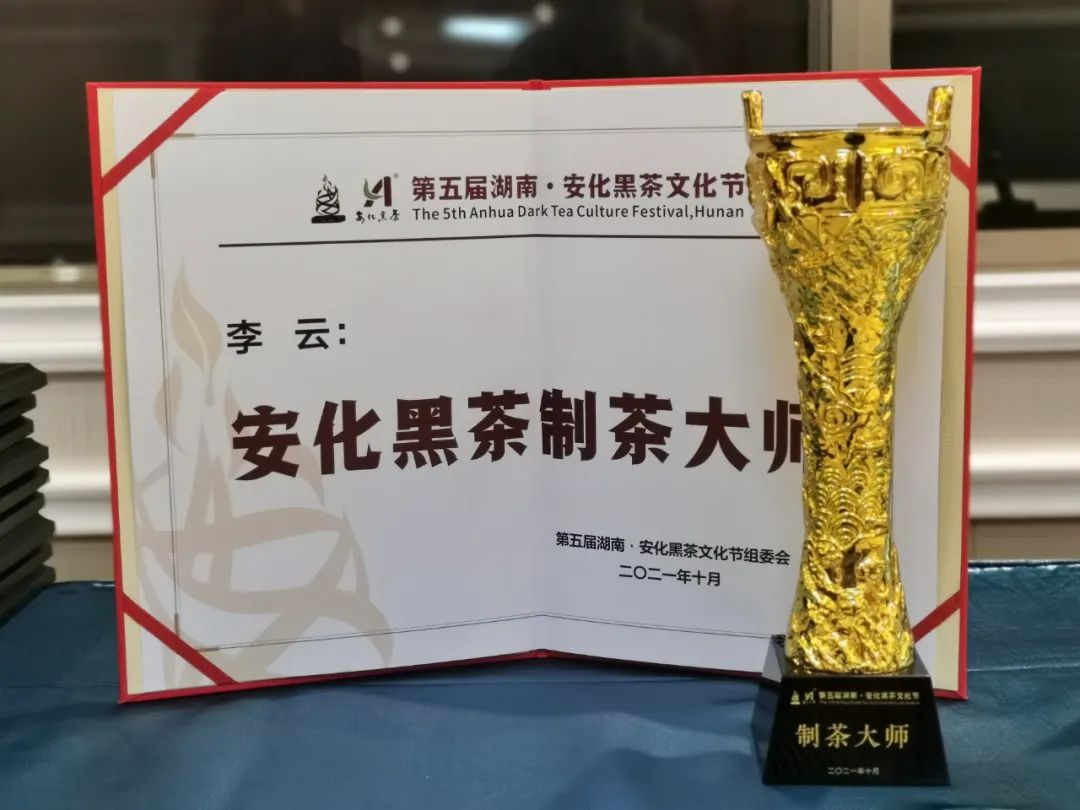 2021年10月22日,以“安化黑茶, 健康大业”为主题的第五届湖南•安化黑茶文化节茶商大会暨胡润·中国茶产业新经济发展论坛在安化县天下黑茶大剧院隆重举行。本次盛会的目的在于向外界传播和宣扬安化24小时健康茶生活、黑茶产业发展新路径和产城融合新面貌,旨在加强与促进安化“茶旅.文体.康养”深度融合发展。本次盛会荟聚了来自全国各地的1400余名茶叶专家、茶企客商。大家“聚于斯”共襄安化黑茶茶业盛会,各自发挥聪明才智,为安化黑茶产业发展大计“把脉”与“献计”,以此助力安化黑茶实现“铸牢茶业品牌,达到茶饮养生”的康养理念。在此次盛会上,主办单位和组委会为了肯定和褒奖对安化黑茶产业作出突出贡献的单位与个人还开展一系列荣誉的评比活动。云天阁茶业创始人李云先生在本次评比活动中脱颖而出,获得“安化黑茶制茶大师”这一殊荣。