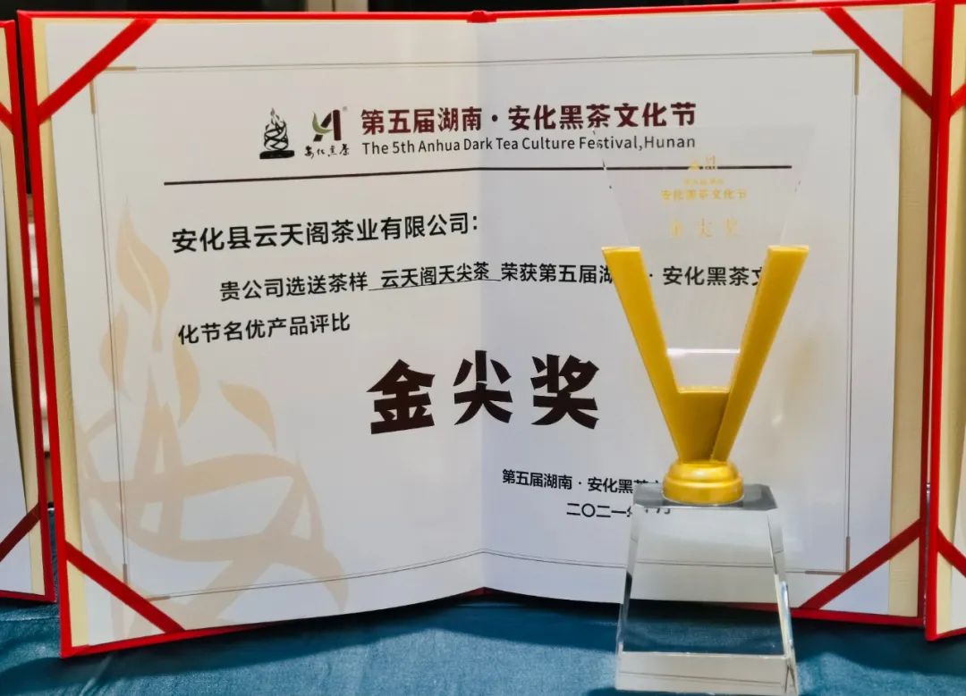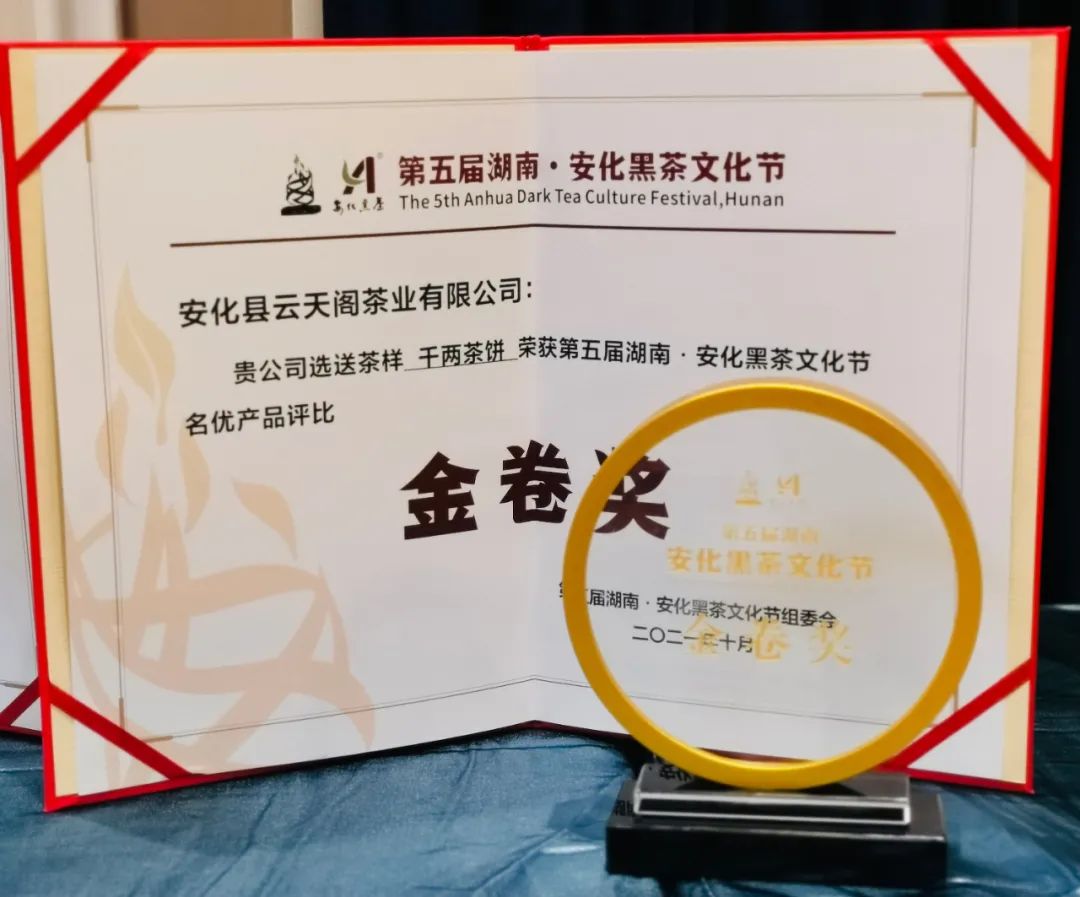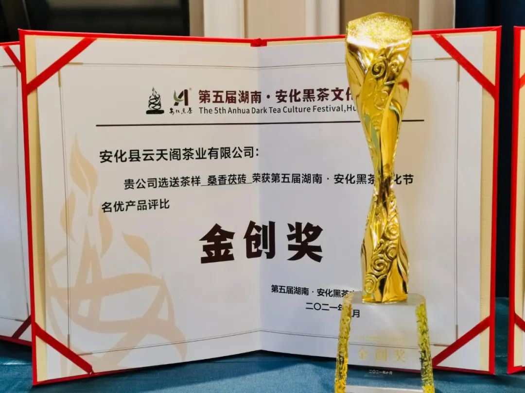 2021年10月22日,第五届湖南·安化黑茶文化节在湖南安化天下黑茶大剧院开幕。云天阁喜获丰收,在本次文化节名优产品评比中,桑香茯砖荣获“金创奖”,天尖茶荣获“金尖奖”,千两饼荣获“金卷奖”。