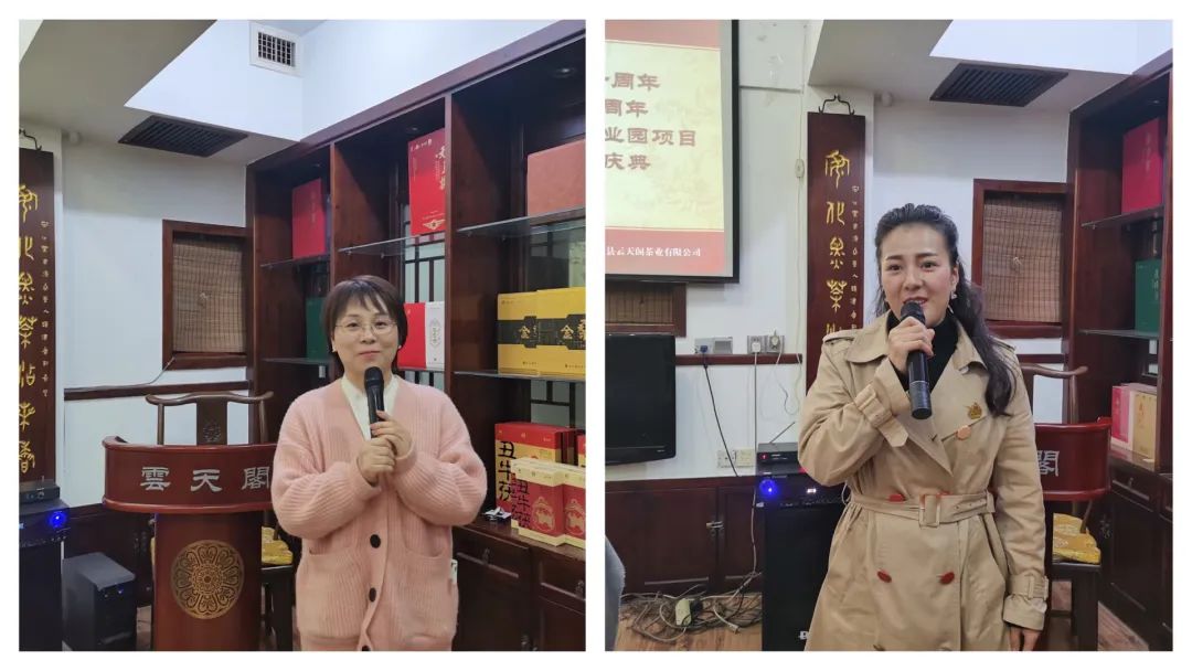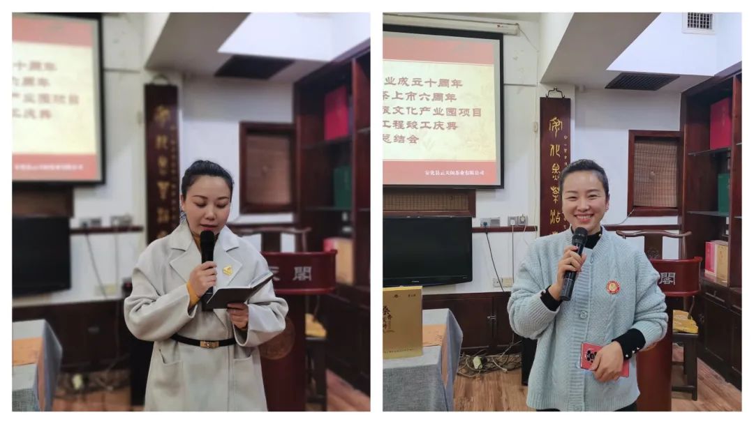 副总经理李劲峰回顾了本次庆典活动的主要成就:一是被纳入第五届湖南·安化黑茶文化节系列活动;二是在刘仲华院士新书《安化黑茶品质化学与健康密码》首发式上,我公司创新产品“桑香茯砖”和“元勋茯”分别在此书第十章的185页和186页上,这不仅是院士对公司产品功效的肯定,更是对公司形象以及云天阁品牌影响力的肯定;三是云天阁茶业创始人李云被评为“第五届湖南•安化黑茶文化节安化黑茶制茶大师”,长沙市雨花区云中琼阁黑茶商行获得“安化黑茶十大杰出经销商”荣誉称号,经销商张群、李季、常华亭、陈国强、刘桃枝、方萍、李冬梅、杨智华、文小燕等9位获得“安化黑茶优秀经销商”荣誉称号;四是在本次文化节名优产品评比中,桑香茯砖荣获“金创奖”,天尖茶荣获“金尖奖”,千两饼荣获“金卷奖”;五是成功举办了云天阁茶业成立十周年、桑香黑茶上市六周年暨云天阁茶旅文化产业园项目一期工程竣工庆典,益阳市人大常委会党组副书记彭建忠出席,益阳市人民政府副市长汤瑞祥作重要讲话,中国工程院院士、桑香黑茶产学研领导小组组长刘仲华,中国茶叶流通协会副会长姜竹林,湖南省蚕桑科学研究所副所长、桑香黑茶产学研课题组组长颜新培,湖南安化经开区党工委书记周华山、安化县云天阁茶业有限公司总经理李云分别致辞,中共安化县委副书记、统战部部长潘文剑主持庆典。