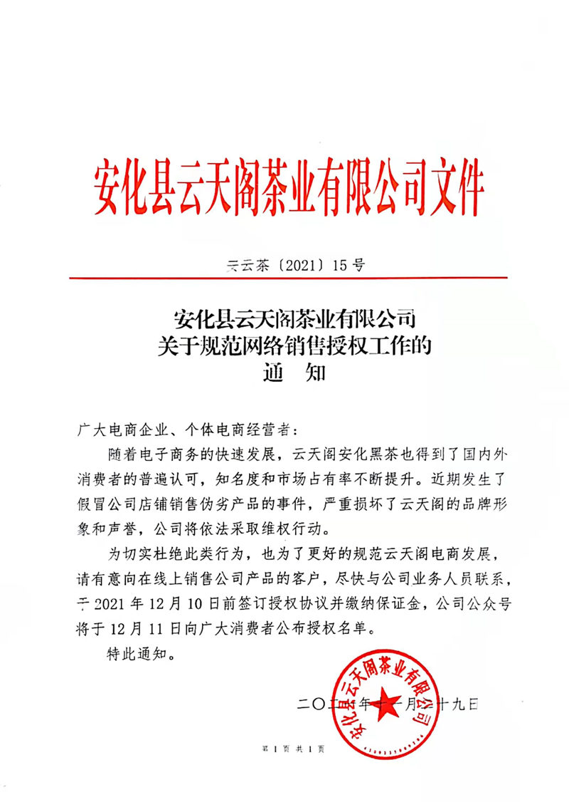 为切实杜绝此类行为,也为了更好的规范云天阁电商发展,请有意向在线上销售公司产品的客户,尽快与公司业务人员联系,于2021年12月10日前签订授权协议并缴纳保证金,公司公众号将于12月11日向广大消费者公布授权名单。