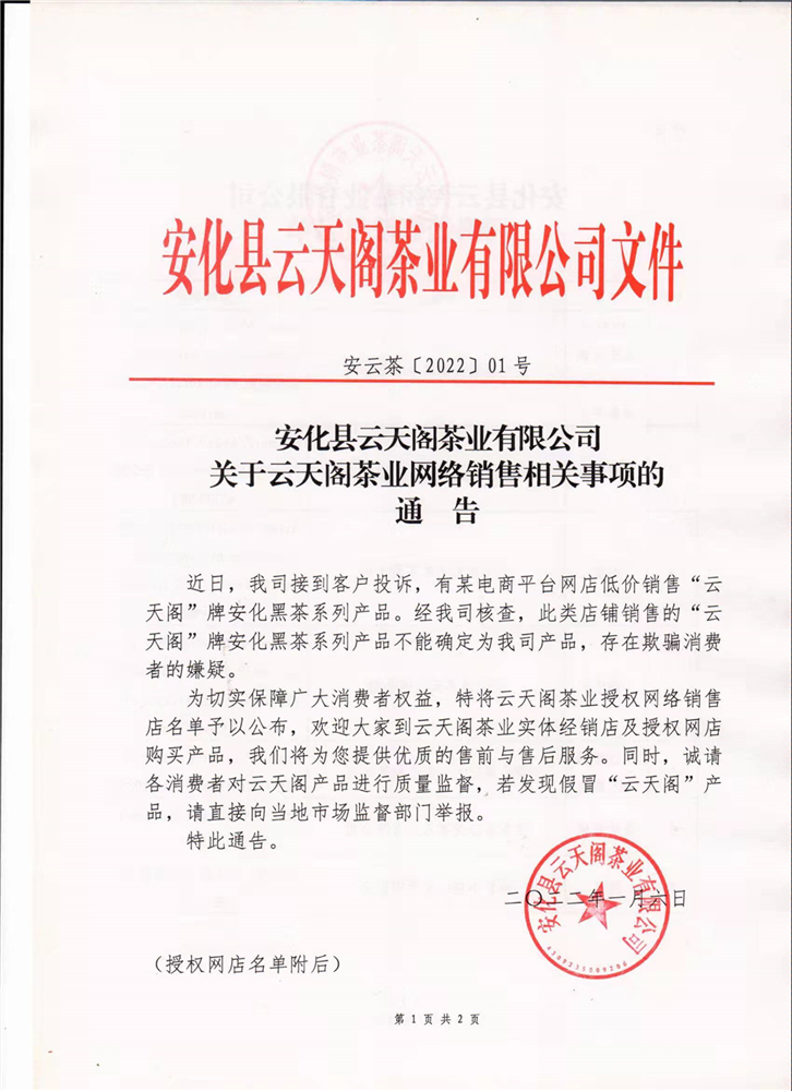 为切实保障广大消费者权益,特将云天阁茶业授权网络销售店名单予以公布,欢迎大家到云天阁茶业实体经销店及授权网店购买产品,我们将为您提供优质的售前与售后服务。同时,诚请各消费者对云天阁产品进行质量监督,若发现假冒“云天阁”产品,请直接向当地市场监督部门举报。