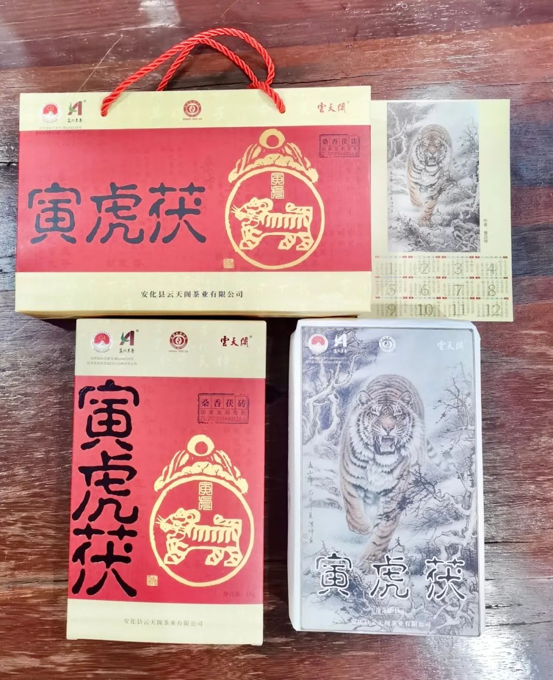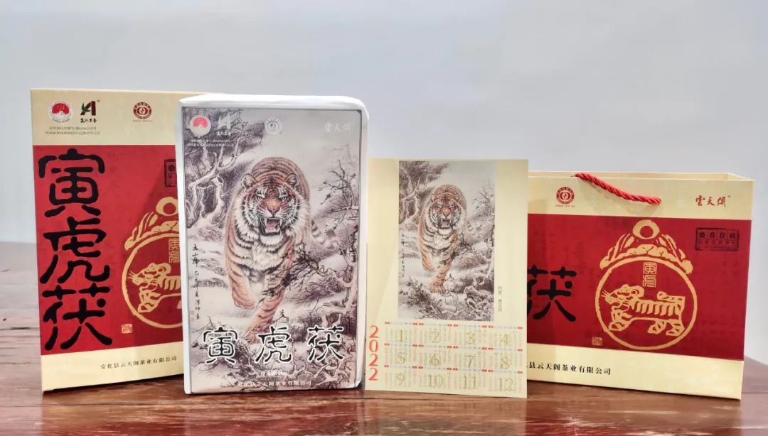 2022寅虎茯生肖纪念茶。寅虎图形设计、内包装丑牛国画由著名古建筑专家、高级工程师、新型复合材料仿古建筑研究发起人曹汉坤先生创作。一年一幅生肖画,珍藏十二位美术家之作。“源头黑茶,香飘天下”由杂交水稻之父袁隆平院士题写。