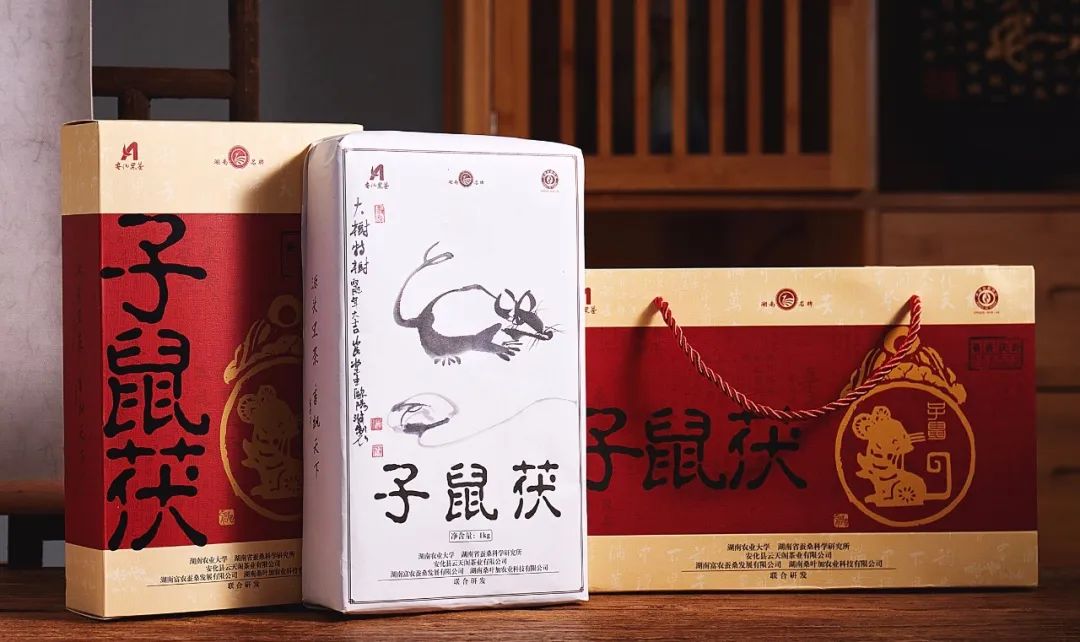 2020年首套生肖茶子鼠茯, 鼠为十二生肖之首,子鼠图形设计由著名古建筑专家、高级工程师、新型复合材料仿古建筑研究发起人曹汉坤先生创作。内包装子鼠国画由中国美术家协会会员、益阳市美术家协会常务副主席欧阳波先生创作。一年一幅生肖画,珍藏十二位美术家之作。“源头黑茶,香飘天下”由杂交水稻之父袁隆平院士题写。