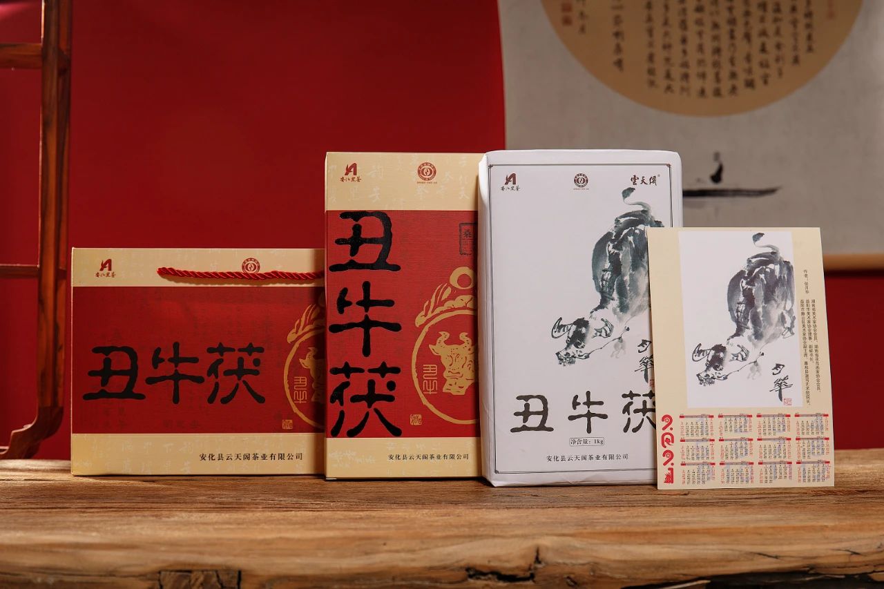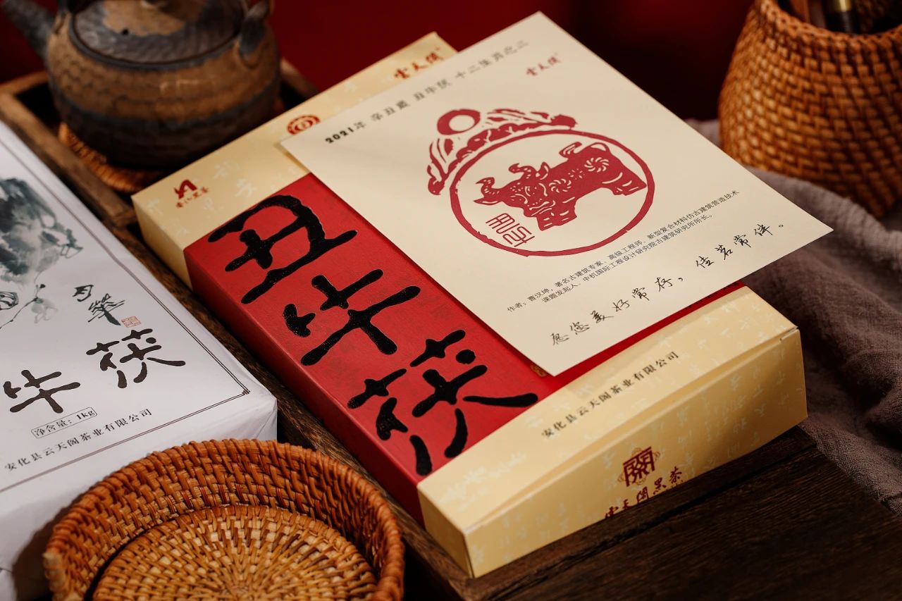 2021年丑牛茯生肖纪念茶。丑牛图形设计由著名古建筑专家、高级工程师、新型复合材料仿古建筑研究发起人曹汉坤先生创作。内包装丑牛国画由湖南省美术家协会会员、湖南省花鸟画家协会会员、益阳市美术家协会理事、副秘书长,益阳市赫山区美术家协会副主席、墨和居速写艺术院院长张月华创作。一年一幅生肖画,珍藏十二位美术家之作。“源头黑茶,香飘天下”由杂交水稻之父袁隆平院士题写。