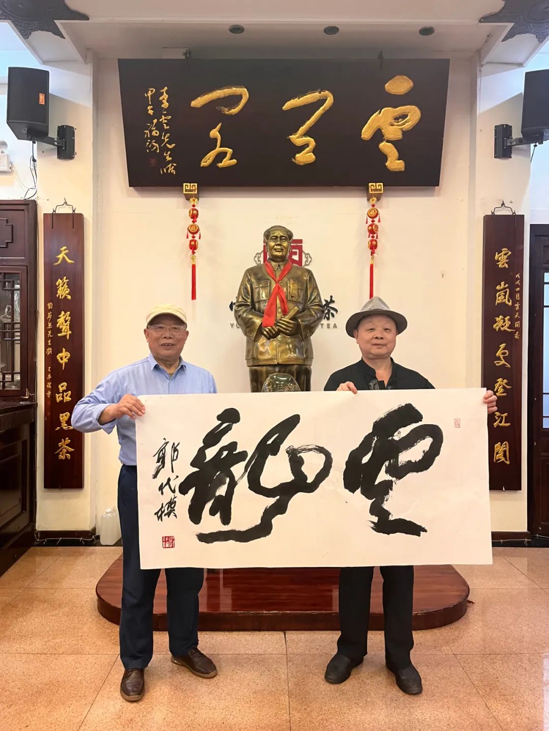 十年前,郭老与李董因茶结缘,他们已是多年的好朋友。当年郭老为云天阁茶业题赠了墨宝“云天阁”三个大字,至今这三个字书法遒劲,入木三分,自成风格,熠熠生辉,它一直作为云天桥三楼牌楼开门迎客的金字大招牌。长期以来,郭老和李总已然成为忘年之交,彼此之间相离不忘,其情感感情犹如陈年黑茶,时岁越久,其味越发陈香,两人每次见面均相谈甚欢,无不彰显着挚友之间关爱与亲切交谈。此次会谈中,一方面李董详细地向郭老介绍了我公司企业文化以及近些年发展历程和产品创新情况;另一方面,又陪同郭老一起品饮刚刚获得“中国十大茶王”称号的桑香茯茶;最后,在场人员还一起开展书法笔会。